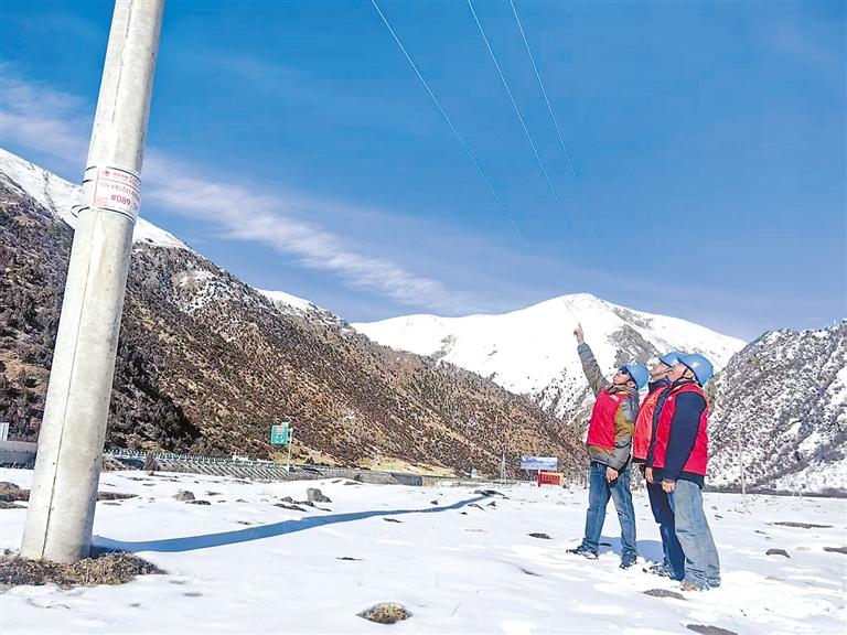 圖為國網(wǎng)工布江達縣供電公司工作人員在檢查線路。記者 劉楓 謝筱純 通訊員 多吉旺堆 張民澤 攝