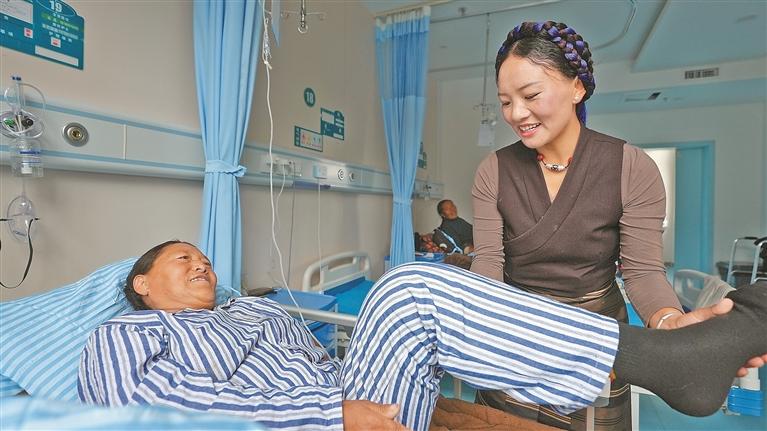 圖為南京市第一醫(yī)院關(guān)節(jié)外科專(zhuān)家團(tuán)隊(duì)了解患者術(shù)后康復(fù)情況。記者 格桑倫珠 攝