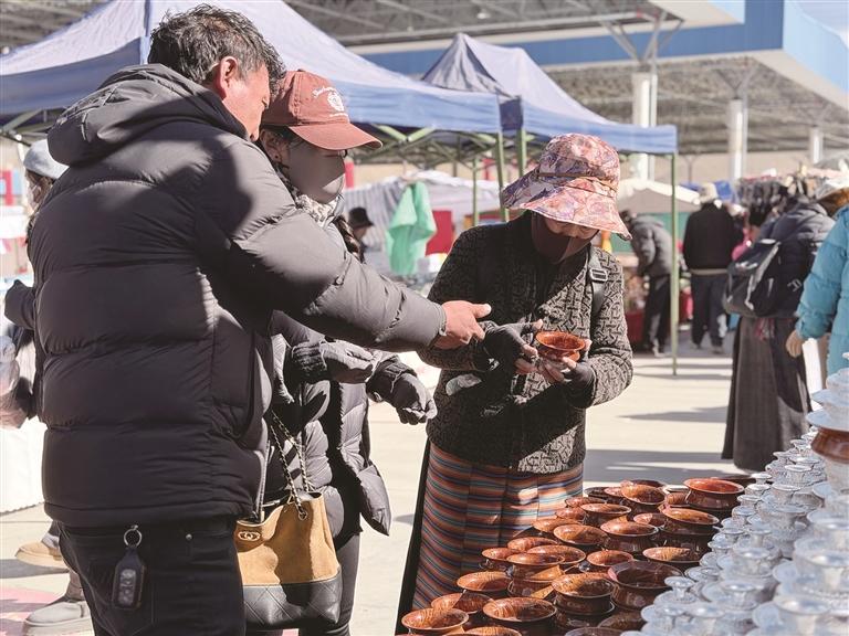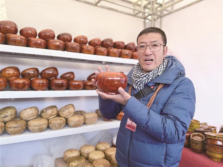 參展商戶們早早備好貨物,在展位前忙碌接待,不少人首日就收獲滿滿。不丹籍商戶扎西已是第二年參展,去年10萬元貨物售罄的好業(yè)績讓他今年信心倍增,帶來價值30萬元-40萬元的8個品種的產(chǎn)品,“物交會的人氣一年比一年旺,去年結識的本地合作伙伴今年還來進貨,加上今年有物流補貼和線上推廣,我的木碗能賣到更遠的地方,太省心了。”加查縣商戶群培帶著自家手工制作的木碗連續(xù)參展20年,開幕僅一個多小時就入賬3000余元,他感慨道:“從跟著父親來擺攤到如今有了固定展位,物交會越辦越規(guī)范,如今不僅僅是本地顧客認可我們的手藝,還有外地游客也會前來咨詢購買,生意越來越有奔頭?!?/p>