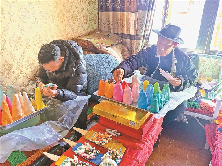多年來(lái),羅布累計(jì)培養(yǎng)了400多名學(xué)徒。每年藏歷新年前,他都會(huì)組織為期一個(gè)月的集中培訓(xùn),之后帶著大家到拉薩共同參與酥油花創(chuàng)作。不少學(xué)徒學(xué)成后技藝精湛,靠著這門手藝站穩(wěn)了腳跟。如今,酥油花制作已成為當(dāng)?shù)卮寮w經(jīng)濟(jì)發(fā)展的重要支柱,更是改善群眾生活的主要收入來(lái)源,村里不少家庭全家參與制作,人人都是技藝傳承人。