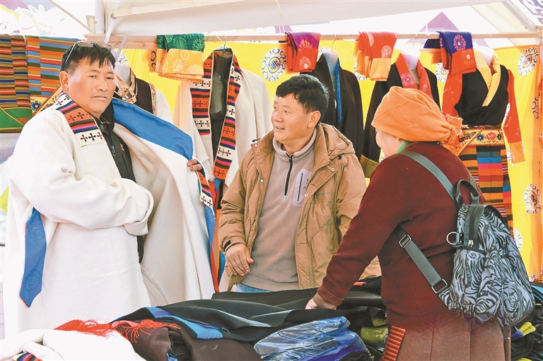來自達(dá)孜區(qū)邦堆鄉(xiāng)的普珍阿佳,帶著自家以傳統(tǒng)方法釀制的青稞酒,吸引了不少新老主顧前來購買;“90后”創(chuàng)業(yè)者達(dá)瓦將藏式紋樣與現(xiàn)代設(shè)計相結(jié)合,制作出的新潮手機(jī)殼、帆布包,成為年輕人爭相選購的“尖貨”;書法家桌前排起長隊,他們或送春聯(lián)、或?qū)憽案!弊?;藏戲、民歌表演的舞臺前更是掌聲不斷。