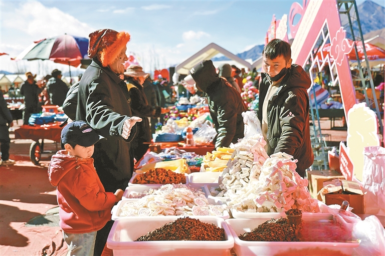 320余個攤位如繁星般鋪開,空氣中彌漫著酥油、藏香與干果混合的復(fù)雜香氣。此起彼伏的吆喝聲、討價還價聲與孩子們歡快的笑聲交織在一起,為這片集市增添了熱鬧的氣息。短短7天,這場年貨盛會便吸引客流約13萬人次,實現(xiàn)銷售總額2802萬元。這不僅是數(shù)字的躍升,更是“政府搭臺、商戶獲利、群眾受益”的良性循環(huán)。
