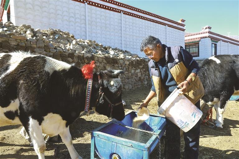 近日,記者走進(jìn)拉薩市墨竹工卡縣工卡鎮(zhèn)格桑村村民擋桑家中,一家人正忙著裝修新房,后院牛舍整齊干凈,一頭頭黑白花良種奶牛膘肥體壯、毛色光亮,正悠閑啃食飼草。看著自家的“寶貝”,擋桑滿臉自豪:“現(xiàn)在養(yǎng)牛越來越順手,每年收入都很可觀?!?/p>