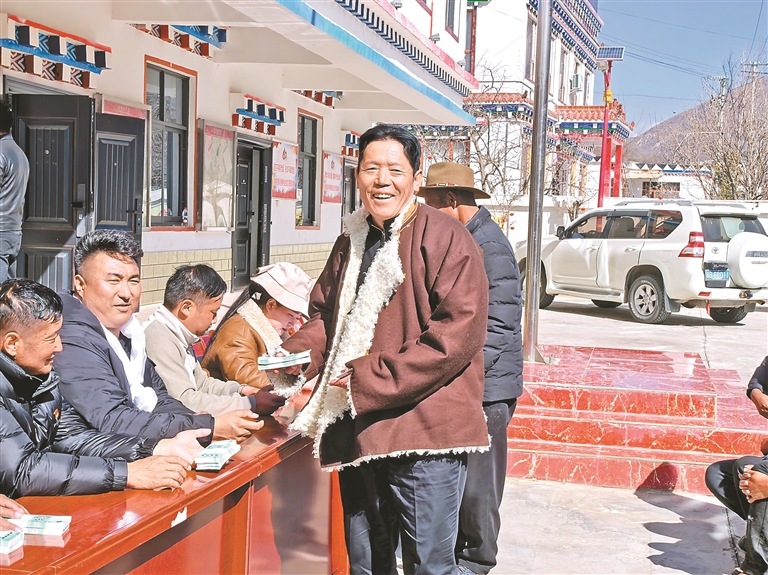 圖為芒康縣朱巴龍村村民喜領(lǐng)分紅。記者 黃澤陽 攝