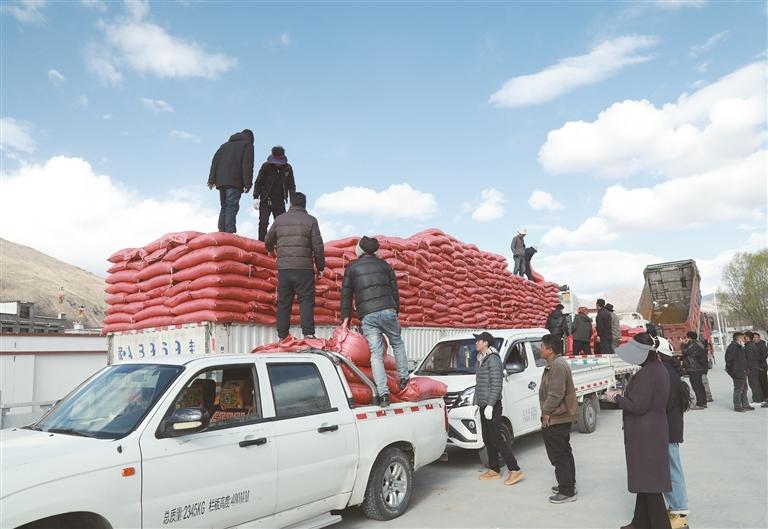 4月7日,拉薩市墨竹工卡縣舉行防抗災(zāi)飼草料集中發(fā)放儀式。清晨,墨竹工卡縣農(nóng)業(yè)農(nóng)村局停車場內(nèi),一輛輛滿載飼草的貨車整齊列隊(duì),各鄉(xiāng)鎮(zhèn)工作人員有序到場卸貨、裝車,現(xiàn)場一派繁忙有序的景象。