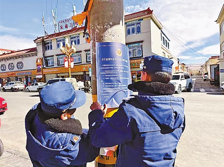 圖為噶爾縣消防救援大隊消防宣傳員在街頭巷尾張貼電動自行車消防安全海報。