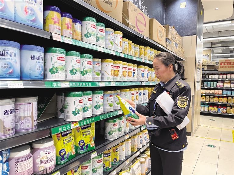 執(zhí)法人員對永輝超市(城關(guān)萬達廣場店)嬰幼兒配方乳粉進行檢查。