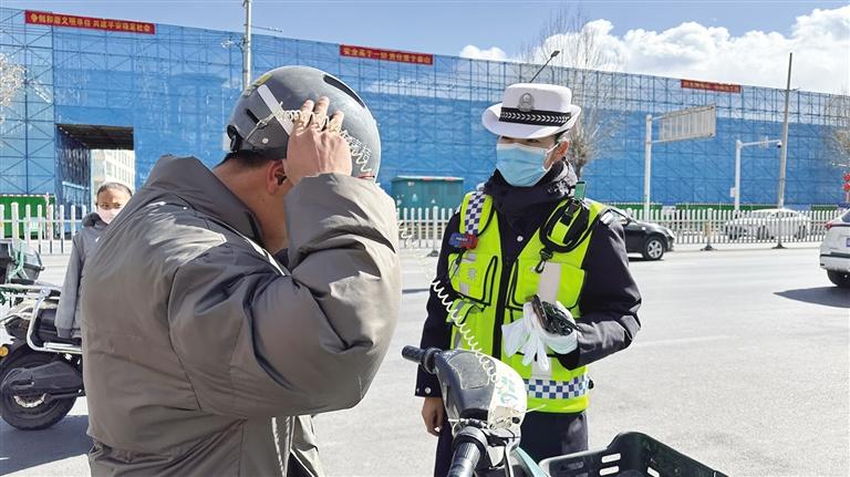 民警讓電動(dòng)自行車駕駛員佩戴安全頭盔。