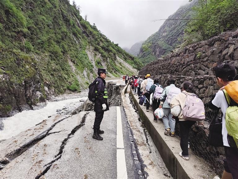 為有效判斷路況和進(jìn)行風(fēng)險(xiǎn)預(yù)測(cè),由邊境派出所領(lǐng)導(dǎo)和經(jīng)驗(yàn)豐富的老民警組成的救援突擊隊(duì),在7月7日背負(fù)藥品、食物、飲用水等救援物資及通信設(shè)備,徒步20余公里向著災(zāi)區(qū)奮力挺進(jìn)。“要以人民群眾生命財(cái)產(chǎn)安全為重,一定要將滯留人員順利護(hù)送轉(zhuǎn)移出來?!痹摯箨?duì)日屋邊境派出所所長(zhǎng)扎西頓珠再三叮囑隊(duì)員們。