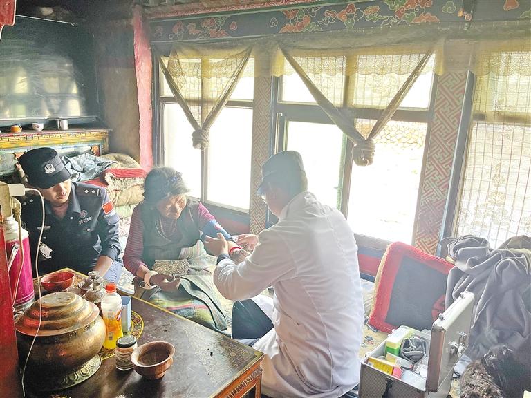 珠峰邊境派出所民警上門為駐地老人檢查身體。(本文配圖由本報(bào)通訊員 景浩 本報(bào)記者 楊子彥 攝)