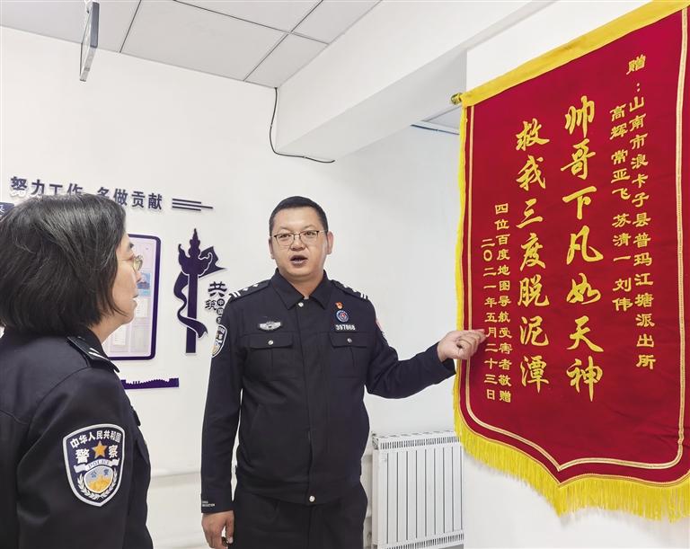 “帥哥下凡如天神,救我三度脫泥潭!”如果錦旗有生命,憑借這兩行字,它無(wú)疑會(huì)成為最引人注目的那一個(gè)。這面特別的錦旗存放在山南市邊境管理支隊(duì)普瑪江塘邊境派出所的榮譽(yù)室里。2021年5月,普瑪江塘邊境派出所接到求助電話,稱4名游客駕車(chē)前往崗布冰川被困沼澤,亟待救援。接警后,民警迅速到達(dá)現(xiàn)場(chǎng)進(jìn)行救援。游客脫險(xiǎn)后千恩萬(wàn)謝,與民警互留電話。民警叮囑他們趕緊離開(kāi),不要再去冰川了。然而走了還不到5分鐘,民警又接到電話,稱他們?cè)俅务{車(chē)陷入泥沼動(dòng)彈不得。警車(chē)原路返回,進(jìn)行救援。然而民警剛離開(kāi)10分鐘,再次接到了游客電話:“警官,非常不好意思,我們又陷進(jìn)去了還得麻煩你們?cè)倩貋?lái)一趟?!庇谑?,這面“救我三度脫泥潭”的錦旗便誕生了。