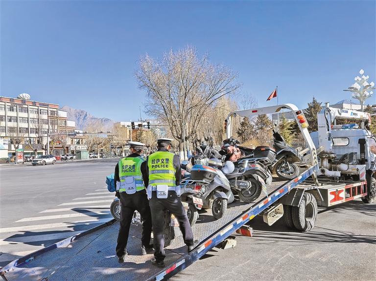 圖為拉薩交警正在清理超標(biāo)電動(dòng)車(chē)。