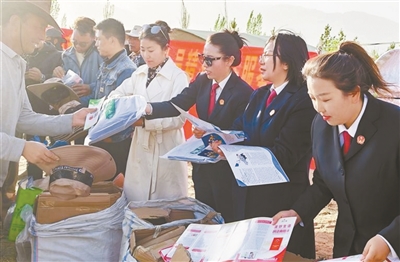 圖為林周縣人民法院工作人員為群眾發(fā)放“生態(tài)法治禮包”。西藏日?qǐng)?bào)記者 拉巴桑姆攝