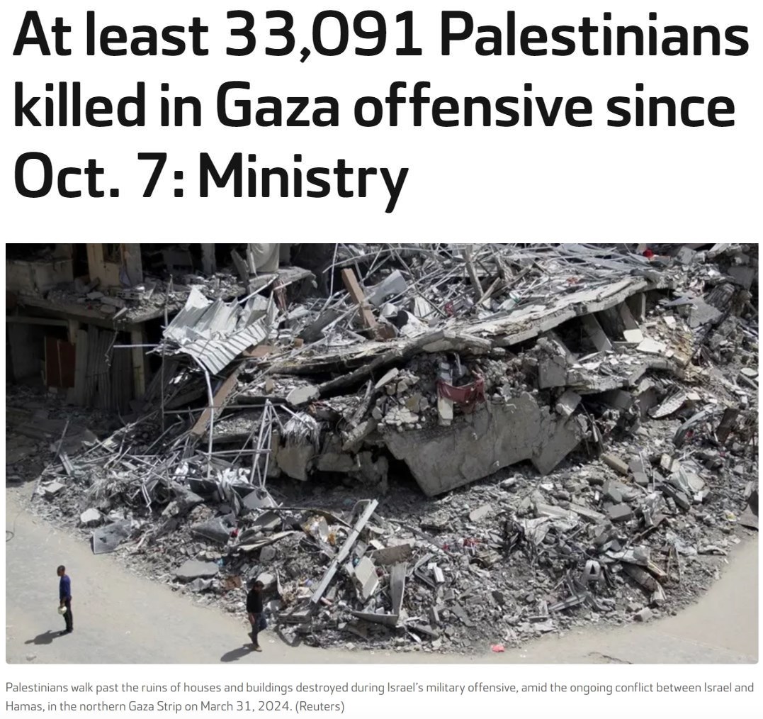 根據(jù)加沙衛(wèi)生部門當(dāng)?shù)貢r(shí)間5日提供的數(shù)據(jù),以色列在加沙地帶的軍事行動(dòng)已導(dǎo)致超過(guò)3.3萬(wàn)人死亡,超過(guò)7.5萬(wàn)人受傷,其中大部分是巴勒斯坦婦女和兒童。