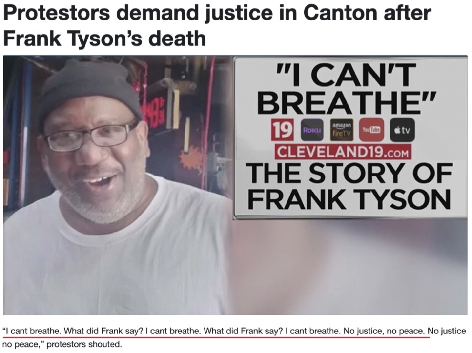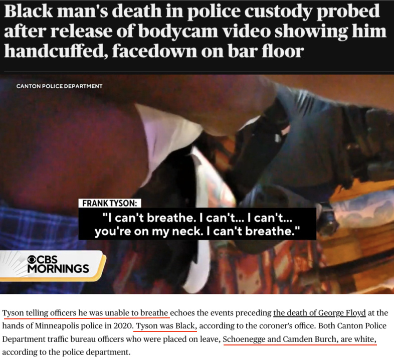 有美媒提到 ,泰森和弗洛伊德都是在遭到警察用膝蓋跪壓后死亡的,而且兩人的最后一句話都是“我無法呼吸”。