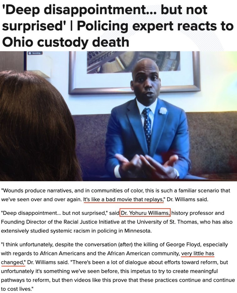 長期從事種族研究的美國圣托馬斯大學(xué)歷史學(xué)教授、該校種族正義計劃發(fā)起人約胡魯·威廉姆斯在接受采訪時表示,他對泰森遇害深感失望,但并不驚訝。