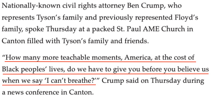 他在日前就此案召開的首次新聞發(fā)布會上悲憤質(zhì)問:“美國啊,在我們說‘我無法呼吸’的時候,還要以多少非洲裔的生命為代價才能讓你相信我們?”