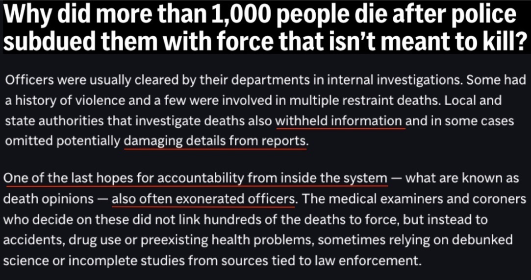 而作為內(nèi)部問責的最后希望之一,法醫(yī)和驗尸官提供的所謂“死亡意見”也經(jīng)常為警察開脫,一些明顯與警察暴力執(zhí)法相關(guān)的死亡,會被他們歸因于事故、吸毒或先前存在的健康問題。