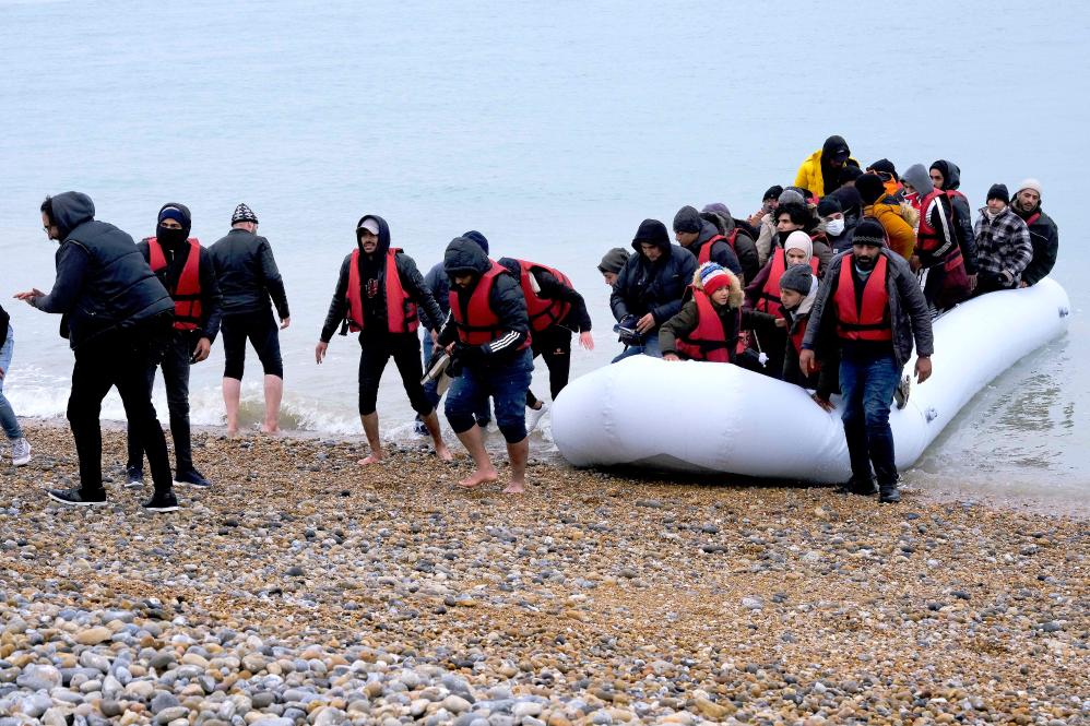 圖為2021年11月24日,移民乘船抵達(dá)英國(guó)鄧杰內(nèi)斯角海岸。(新華社發(fā),史蒂夫·芬恩攝)