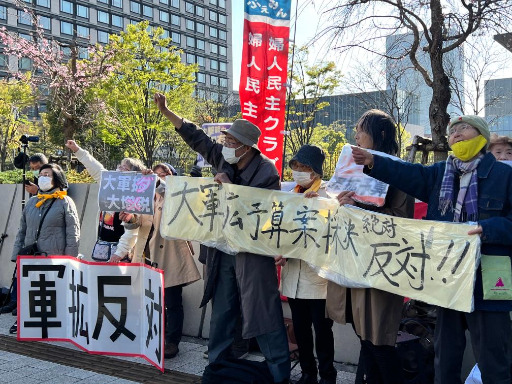 2023年3月28日,在日本東京,民眾在參議院議員會館前舉行抗議活動,反對參議院當天通過“軍備擴張預(yù)算”案。新華社記者姜俏梅攝
