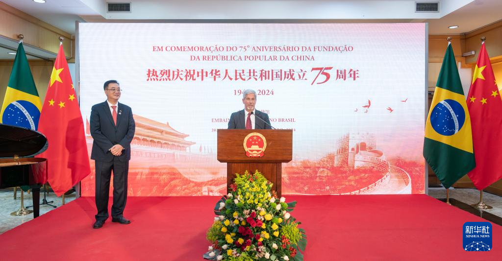 9月25日,巴西副外長(zhǎng)勞德馬爾(右)在巴西利亞舉行的慶祝中華人民共和國(guó)成立75周年招待會(huì)上致辭。新華社記者 王天聰 攝