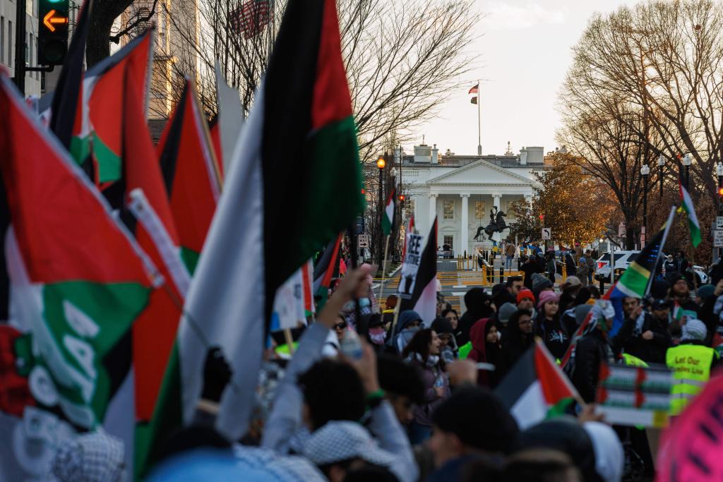 1月13日,在美國首都華盛頓,人們參加聲援巴勒斯坦的集會游行活動。大批示威者揮舞旗幟和標語,高喊口號聲援巴勒斯坦,呼吁?;稹P氯A社發(fā)(亞倫攝)