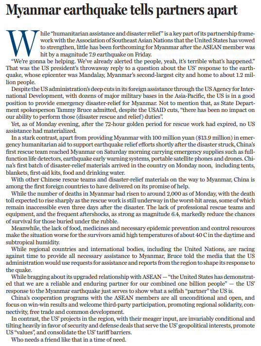 “人道主義援助和救災”是美國與東盟伙伴關系的重要內(nèi)容,美國也信誓旦旦地宣稱要加強救援合作,但截至3月31日下午,緬甸地震72小時救援黃金時間已經(jīng)過去,緬甸當?shù)厝晕闯霈F(xiàn)美國救援隊的身影。