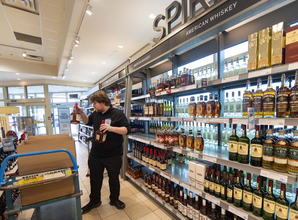 2025年3月4日,在加拿大安大略省的奧克維爾,一酒商門店的店員從貨架上撤下美國(guó)品牌酒產(chǎn)品。新華社發(fā)(鄒崢攝)