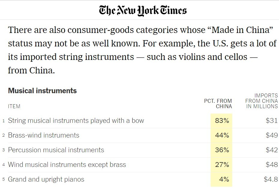 文章說(shuō),從清單中可以看出,美國(guó)從中國(guó)進(jìn)口的主要商品都是消費(fèi)品,覆蓋生活中的多個(gè)場(chǎng)景:你衣櫥中的領(lǐng)帶、手套和連褲襪幾乎都是從中國(guó)進(jìn)口的;如果你是一名運(yùn)動(dòng)員,尤其是球類運(yùn)動(dòng)的運(yùn)動(dòng)員,那么你用的羽毛球、乒乓球、網(wǎng)球、健身房設(shè)備、泳池設(shè)備等都非常依賴“中國(guó)制造”;還有一些消費(fèi)品類別的“中國(guó)制造”可能不那么廣為人知。例如,美國(guó)從中國(guó)進(jìn)口了大量弦樂(lè)器,包括小提琴和大提琴。維生素及其衍生物也大量從中國(guó)進(jìn)口,還有各種冷凍魚(yú)類,包括鰻魚(yú)、鱈魚(yú)、羅非魚(yú)等等。