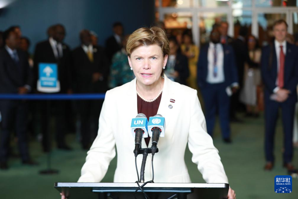 6月3日,在位于紐約的聯(lián)合國總部,拉脫維亞外長拜芭·布拉澤在拉脫維亞當選聯(lián)合國安理會非常任理事國后講話。新華社記者 謝鍔 攝