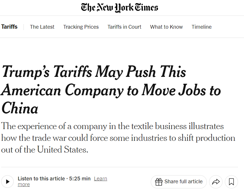 文章說,特朗普政府發(fā)起的全球貿(mào)易戰(zhàn)動搖了Cocona Labs公司的經(jīng)濟基礎(chǔ)。受到美國關(guān)稅不確定性的影響,加之中國實施的對等反制措施,這家美國公司將開始做出改變:將其核心產(chǎn)品的部分生產(chǎn)從美國轉(zhuǎn)移到中國的工廠生產(chǎn)。