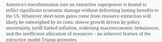 文章認(rèn)為,美國(guó)向資源掠奪型超級(jí)大國(guó)的蛻變,注定將無(wú)法為美國(guó)帶來(lái)持久利益,反而還會(huì)給美國(guó)自身造成重大經(jīng)濟(jì)損害。資源掠奪帶來(lái)的任何短期收益,都可能被以下代價(jià)抵消:政策不確定性導(dǎo)致的增長(zhǎng)放緩、關(guān)稅推高的通貨膨脹、日益擴(kuò)大的宏觀經(jīng)濟(jì)失衡,以及資源配置的低效——這些正是掠奪模式與生俱來(lái)的缺陷。