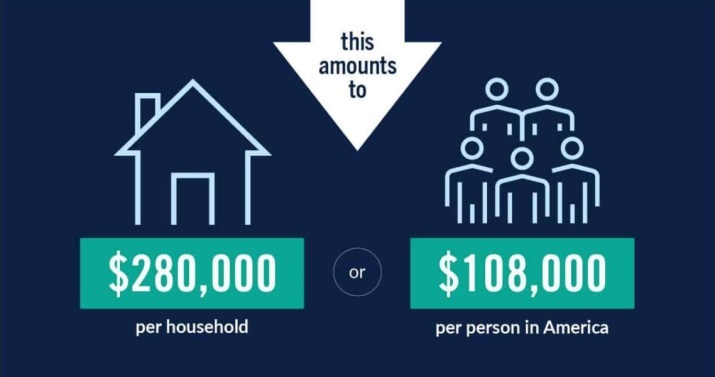 彼得森基金會給出驚人結(jié)果:如果將債務(wù)分?jǐn)偨o美國民眾,相當(dāng)于每戶家庭負(fù)債28萬美元,每個人負(fù)債10.8萬美元。