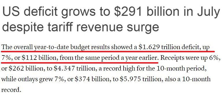 而從本財(cái)年(2024年10月1日至2025年9月30日)的整體情況來看,在截至7月的前十個月,美政府累計(jì)財(cái)政赤字已達(dá)1.63萬億美元,同比增長了7%。