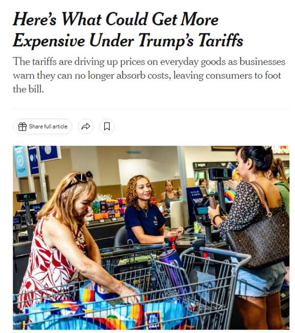 美國政府此前公布的經(jīng)過調(diào)整的“對(duì)等關(guān)稅”已經(jīng)生效,美數(shù)十個(gè)貿(mào)易伙伴將被征收10%至41%不等的關(guān)稅,隨之而來的便是被關(guān)稅推高的物價(jià)。美國《紐約時(shí)報(bào)》刊文稱,美國消費(fèi)者或許很快就會(huì)發(fā)現(xiàn),大到汽車,小到一雙鞋和一根香蕉,幾乎所有商品的售價(jià)都會(huì)上漲。