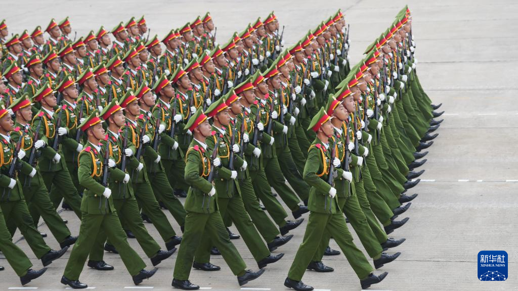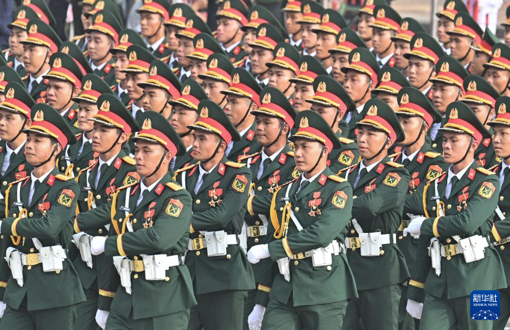 9月2日,在越南河內(nèi)巴亭廣場,越南軍隊(duì)方陣走向主席臺接受檢閱。新華社記者 胡佳麗 攝
