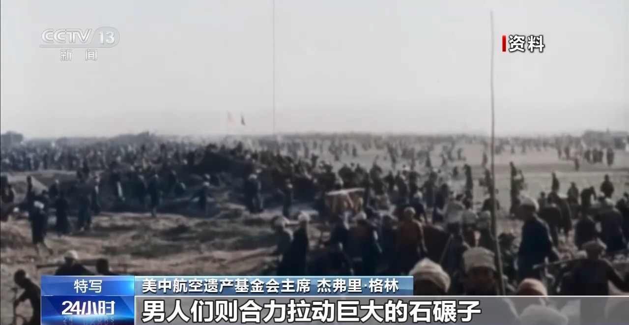 美中航空遺產(chǎn)基金會(huì)主席 杰弗里·格林:婦女們背上背著孩子,坐在地上把大石塊敲成小石子;孩子們?cè)侔研∈訐斓街付ǖ攸c(diǎn);男人們則合力拉動(dòng)巨大的石碾子,有時(shí)候要100個(gè)人才能拉動(dòng)一臺(tái)10噸重的石碾子,就為了把跑道壓平整。無(wú)論是寒冬還是酷暑,婦女們敲碎的每一塊石頭,都是在為機(jī)場(chǎng)出力,為飛機(jī)起降創(chuàng)造條件,讓美國(guó)飛行員能順利升空抗擊日軍。這背后是一種信念:他們所做的一切都在為勝利搭建基礎(chǔ)。