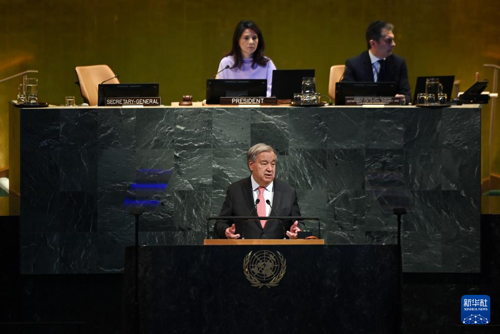 9月22日,在位于紐約的聯(lián)合國(guó)總部,聯(lián)合國(guó)秘書(shū)長(zhǎng)安東尼奧·古特雷斯(前)在紀(jì)念聯(lián)合國(guó)成立80周年高級(jí)別會(huì)議上講話(huà)。新華社記者 李睿 攝
