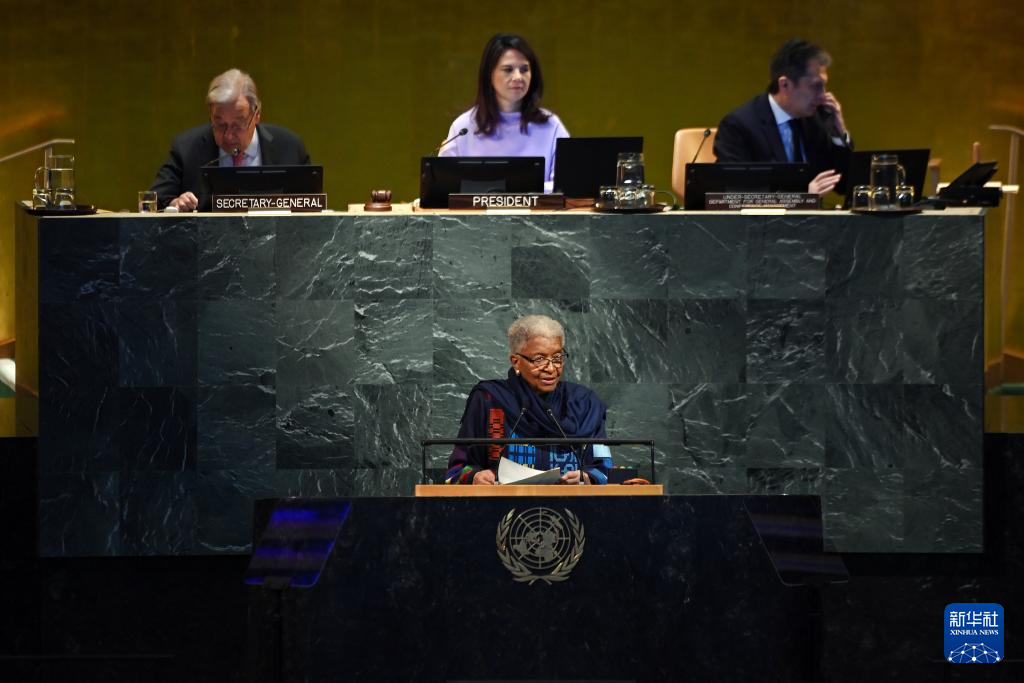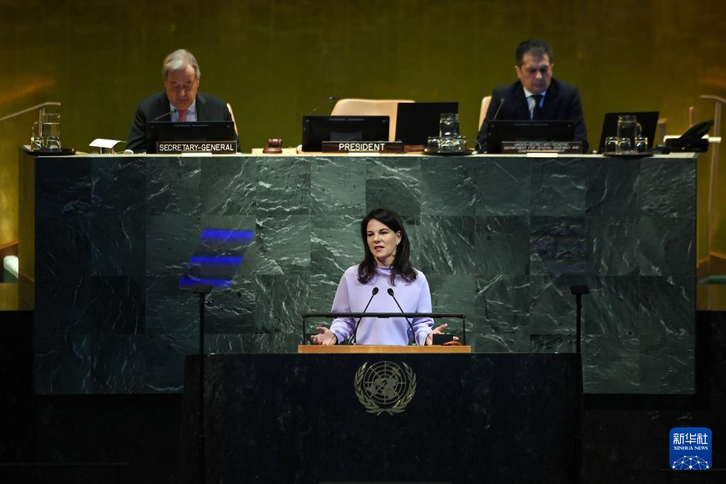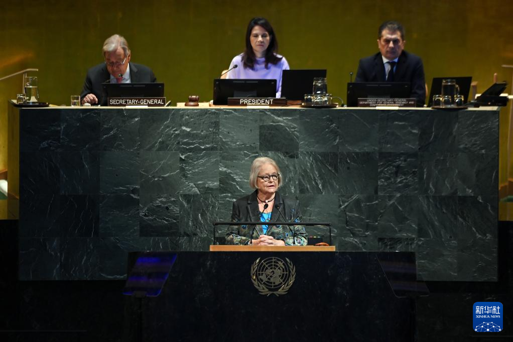 9月22日,在位于紐約的聯(lián)合國(guó)總部,第80屆聯(lián)合國(guó)大會(huì)主席安娜萊娜·貝爾伯克(前)在紀(jì)念聯(lián)合國(guó)成立80周年高級(jí)別會(huì)議上講話(huà)。新華社記者 李睿 攝