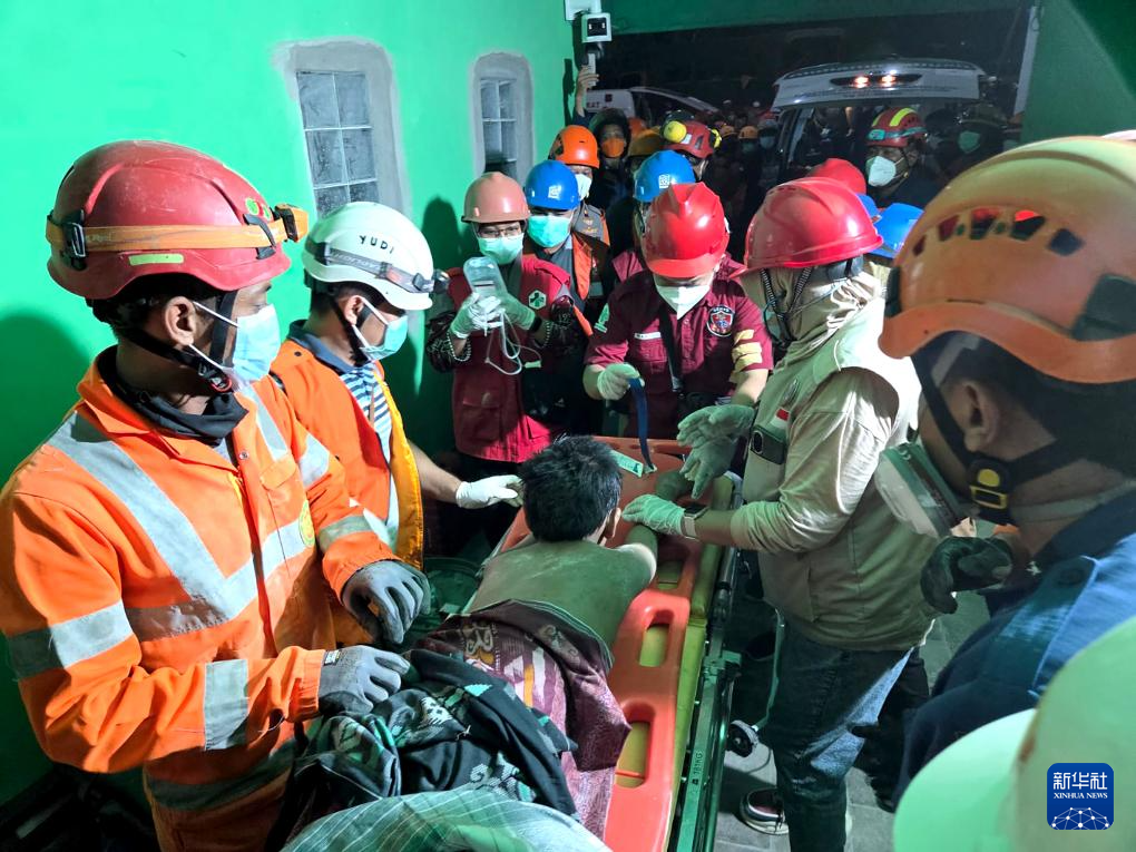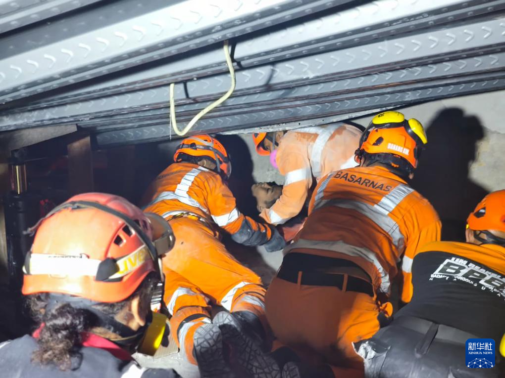 10月1日,救援人員在印度尼西亞東爪哇省詩都阿佐縣建筑倒塌現(xiàn)場救出一名幸存者。新華社發(fā)(印尼國家搜救局供圖)