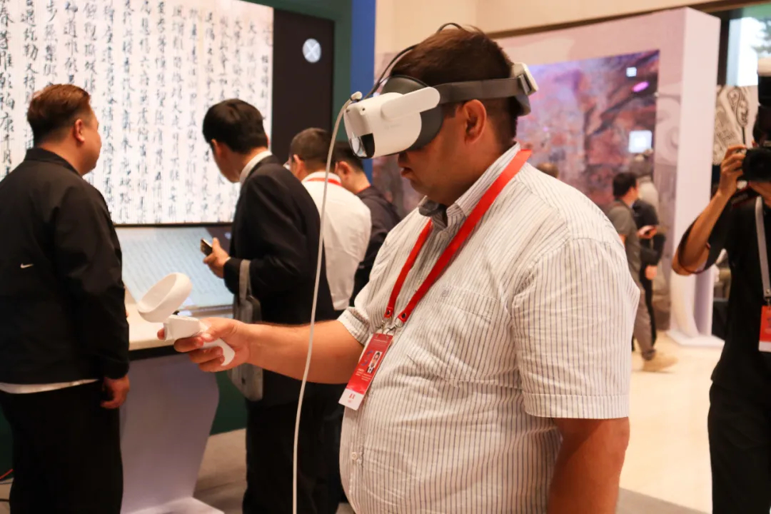 2025年9月17日,陜西西安,2025年世界互聯(lián)網(wǎng)大會文化遺產(chǎn)數(shù)字化論壇開幕。圖為外籍參會者體驗(yàn)數(shù)字化項(xiàng)目。中新社記者 李一璠 攝