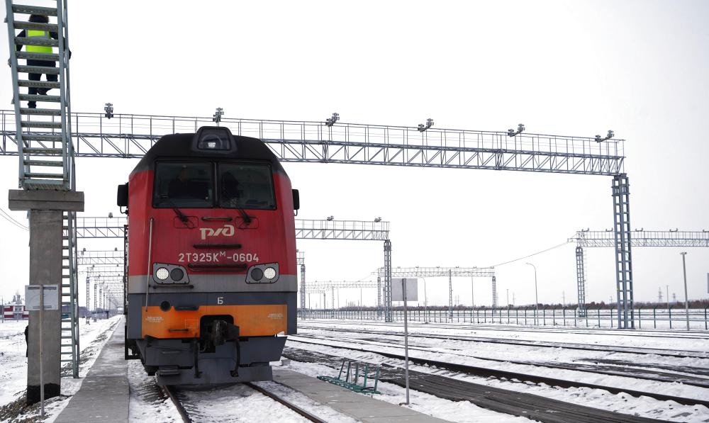12月6日,一輛即將開往中國的俄羅斯貨運(yùn)列車??吭诙砹_斯下列寧斯闊耶鐵路口岸。新華社記者 劉愷 攝