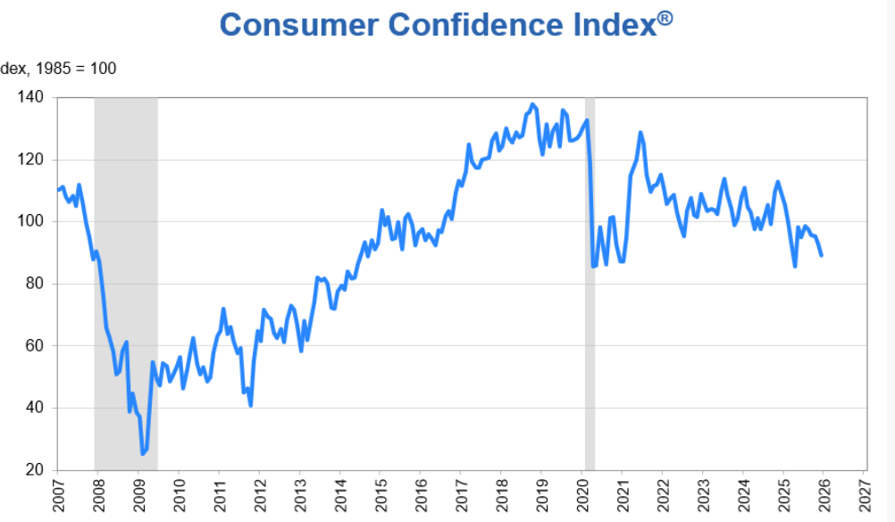 世界大型企業(yè)研究會首席經(jīng)濟學家達娜·彼得森表示,盡管11月的數(shù)據(jù)因聯(lián)邦政府“停擺”結(jié)束而被向上修正,12月消費者信心再次下滑并依然遠低于今年1月的峰值。消費者信心指數(shù)5個成分指數(shù)中有4個出現(xiàn)下降,另一個表現(xiàn)明顯疲弱。