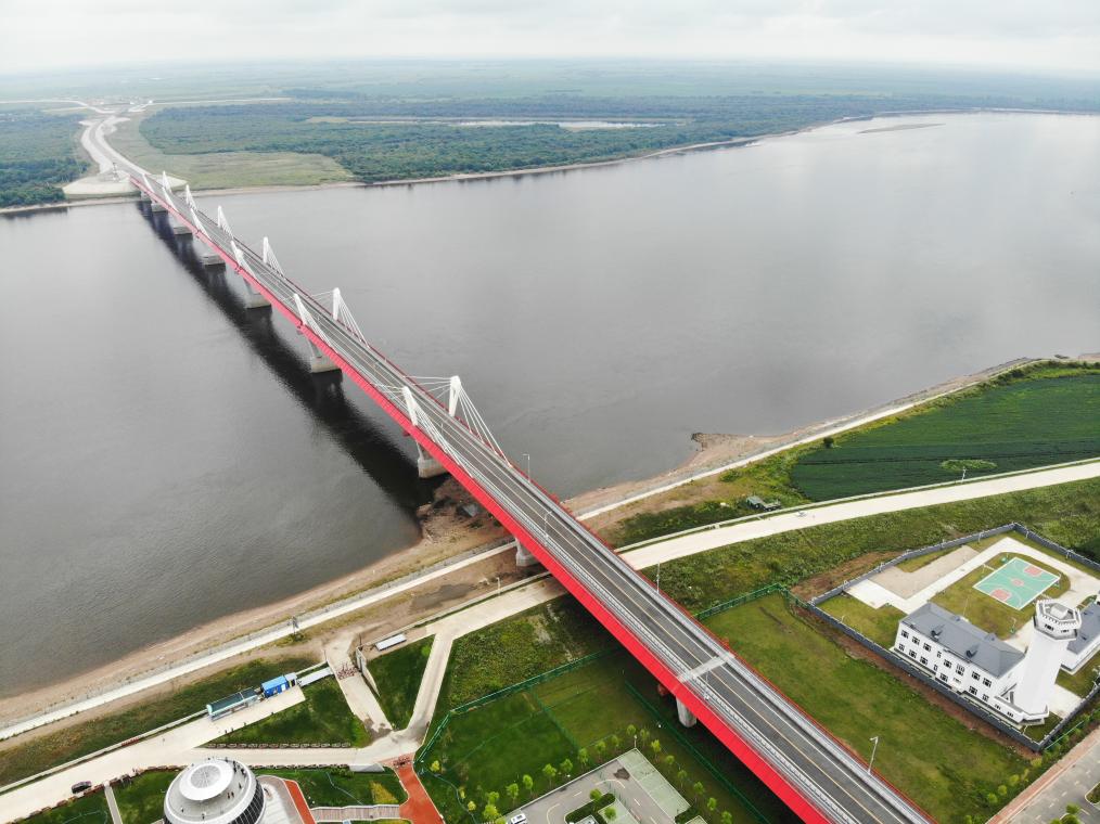 這是2023年8月11日在中國黑河一側(cè)拍攝的黑河-布拉戈維申斯克公路橋(無人機照片)。新華社記者王松攝