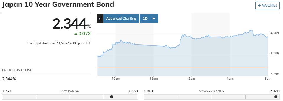 1月20日,日本長期國債在東京債券市場繼續(xù)遭到拋售,導(dǎo)致收益率不斷上揚(yáng)。當(dāng)天,作為日本長期利率指標(biāo)的10年期日本國債收益率一度上升至2.330%,為1999年2月以來的最高水平。這一市場異動恰逢日本政局進(jìn)入敏感時(shí)段,引發(fā)投資者對經(jīng)濟(jì)前景的深度憂慮。