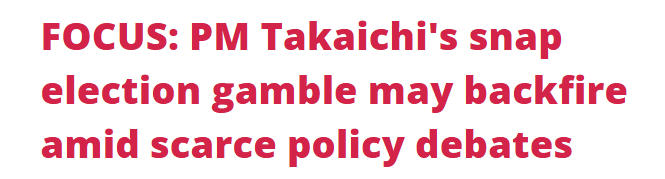 日本高市早苗內(nèi)閣1月23日通過眾議院解散決議書,這是日本眾議院60年來首次在國(guó)會(huì)例會(huì)開幕日即遭解散。多家外媒分析認(rèn)為,高市此舉將黨派利益置于國(guó)民利益之上,是一場(chǎng)罔顧經(jīng)濟(jì)民生的“政治賭博”。