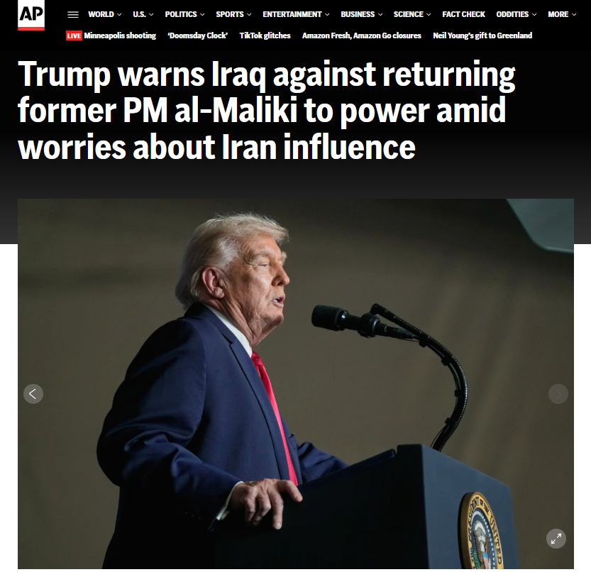 美國總統(tǒng)特朗普當?shù)貢r間1月27日在社交媒體發(fā)文稱,如果伊拉克前總理努里·馬利基再度當選總理,美國將不再“援助”伊拉克。