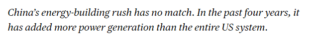 文章說(shuō),中國(guó)的能源建設(shè)速度無(wú)與倫比。過(guò)去四年,中國(guó)新增的發(fā)電容量超過(guò)了整個(gè)美國(guó)電力系統(tǒng)的總和。這種大規(guī)模能源基礎(chǔ)設(shè)施投資幫助中國(guó)降低對(duì)化石燃料依賴(lài),為人工智能數(shù)據(jù)中心等高耗能技術(shù)提供穩(wěn)定電力供應(yīng),從而在全球科技競(jìng)爭(zhēng)中獲得顯著優(yōu)勢(shì)。