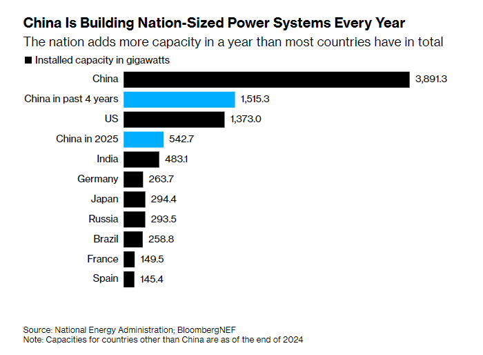 文章援引中國(guó)國(guó)家能源局日前公布的數(shù)據(jù),2025年,中國(guó)各類(lèi)技術(shù)新增發(fā)電裝機(jī)容量達(dá)到543吉瓦(GW)。這一數(shù)字比截至2024年底印度全國(guó)所有發(fā)電廠(chǎng)的總?cè)萘窟€要高出12%。自2021年底以來(lái),中國(guó)新增的發(fā)電容量也已超過(guò)整個(gè)美國(guó)電力系統(tǒng)的總量。