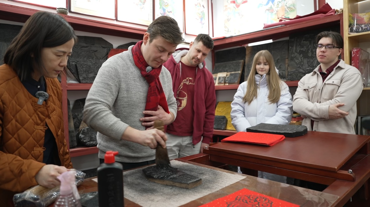 帝漢尼(左二)給匈牙利老鄉(xiāng)們演示怎么拓年畫
